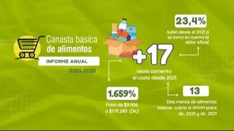 “Si se mide en dólares oficiales, la Canasta Básica Alimentaria aumentó 23,8 por ciento entre 2021 y 2025, y en ese mismo período el salario cubrió 13 días menos de alimentación básica que en el inicio de la serie”, señaló Gerardo Sánchez, economista y asesor de la Fundación Colsecor. El dato deja en evidencia que el encarecimiento no se explica únicamente por la depreciación del peso, sino también por un aumento real del costo de los alimentos. Durante el 2024 fue el costo más de la canasta básica alimentaria medido en dólar oficial; siendo un 35,7 por ciento más caro que en 2021.