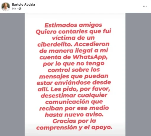 “Quiero contarles que fui víctima de un ciberdelito. Accedieron de manera ilegal a mi cuenta de WhatsApp, por lo que no tengo control sobre los mensajes que puedan estar enviándose desde allí”, publicó Abdala en su cuenta de Facebook.